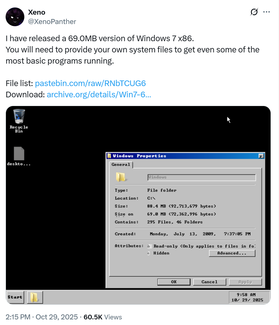 Windows enthusiast @XenoPanther has successfully created and booted a heavily stripped-down version of Windows 7 that takes up only 69 megabytes of disk space. The project, shared online on October 29, demоnstrates how far the operating system can be cut down in size while still achieving a successful boot sequence.