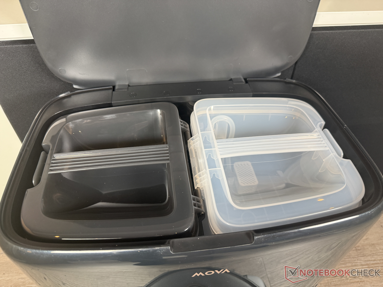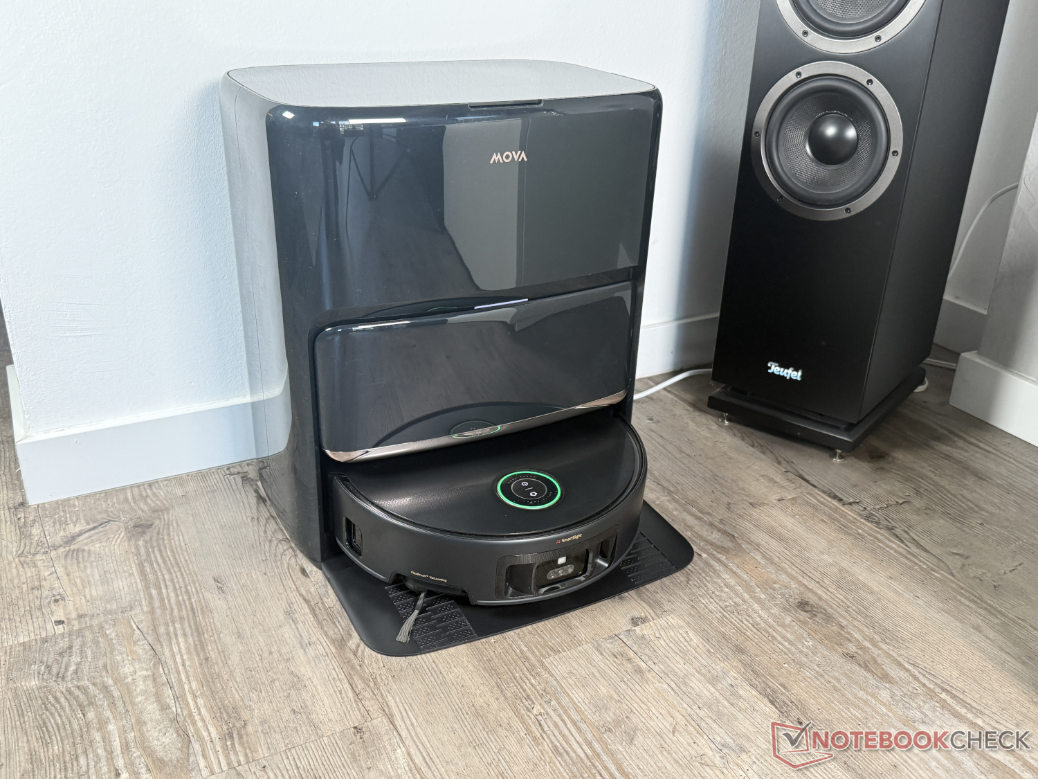 Of course, the base station in the familiar Mova design is also included. It not only cleans the dust container into a 3.2 l dust bag. It also takes care of cleaning the mopping function. Mova uses water at a slightly lower temperature of 80°C than Dreame. However, this did not really affect the visual cleanliness of the mopping roller in the test. Warm air is then used to dry it. In addition, UV sterilization can be activated via the app and two cleaning agents can be dosed automatically.