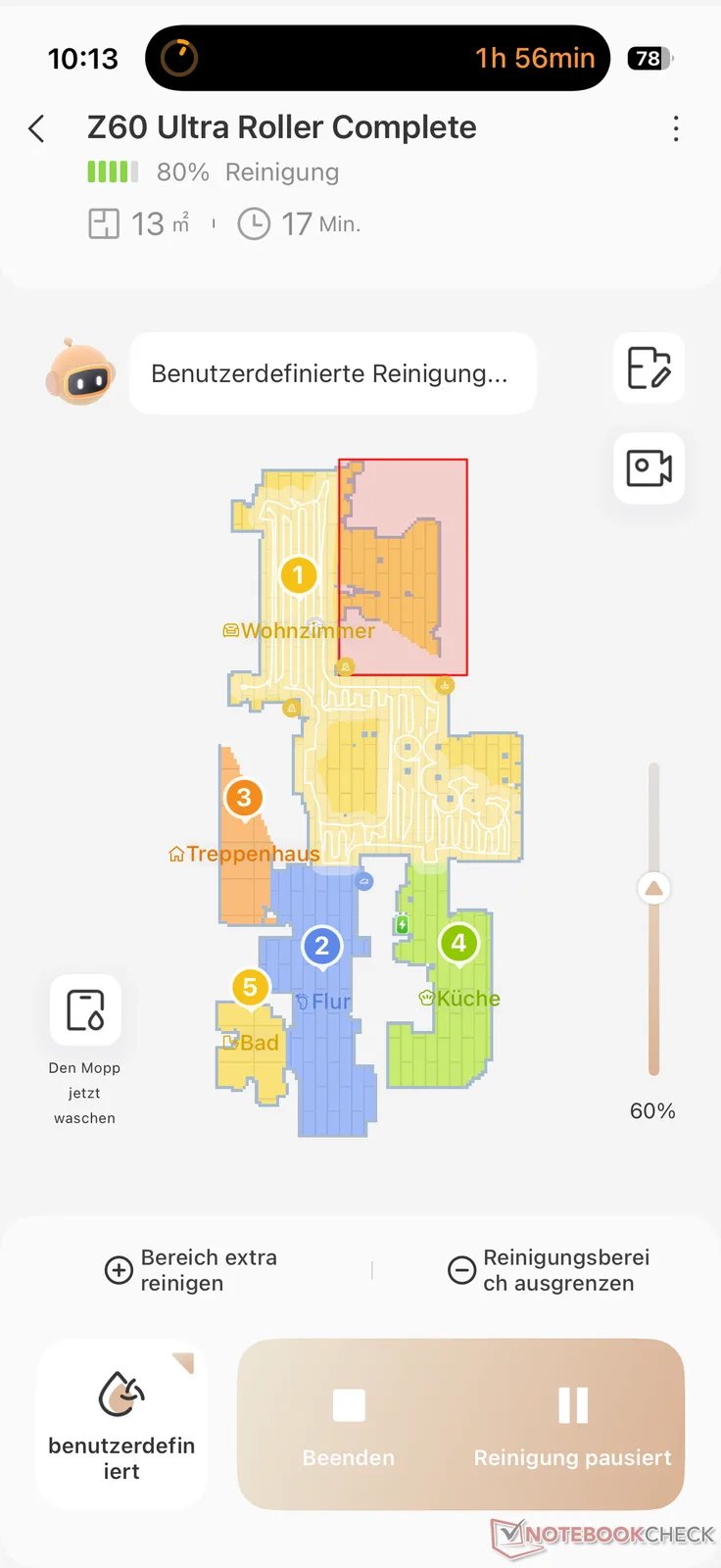 Overall, the navigation of the Mova Z60 Ultra Roller worked reliably in the test. However, it was not one of the fastest in our test area. It takes a little longer to clean than the best competitors. Ultimately, however, this is perfectly acceptable if you don't have a visitor at the door in a few minutes.