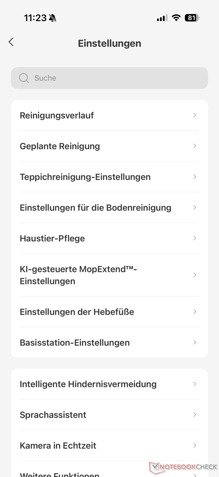 There is little to criticize about the functionality of the Mova app. It offers many options for customizing the cleaning process. In addition to the AI assistant CleanGenius for an automatic and intelligent cleaning process, there are the four usual user-defined modes (vacuuming, mop, vacuuming and mopping, mopping after vacuuming). These can be customized in terms of suction power (four levels), mop pad moisture (32 levels), route (fast, standard) and frequency of return to mop washing.