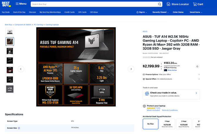 In other markets, Asus pairs the Ryzen AI Max+ 392 with up to 64 GB of RAM. As a result, one could assign up to 48 GB VRAM while still keeping 16 GB RAM for system memory. Unfortunately, Best Buy, B&H Photo Video and Provantage have all confirmed previous suspicions that the US will only receive a 32 GB RAM variant. The TUF Gaming A14 FA401EA will be available in the US for $2,199 with 1 TB of storage, a second M.2 2280 slot, a 165 Hz display and a 73 Wh battery.