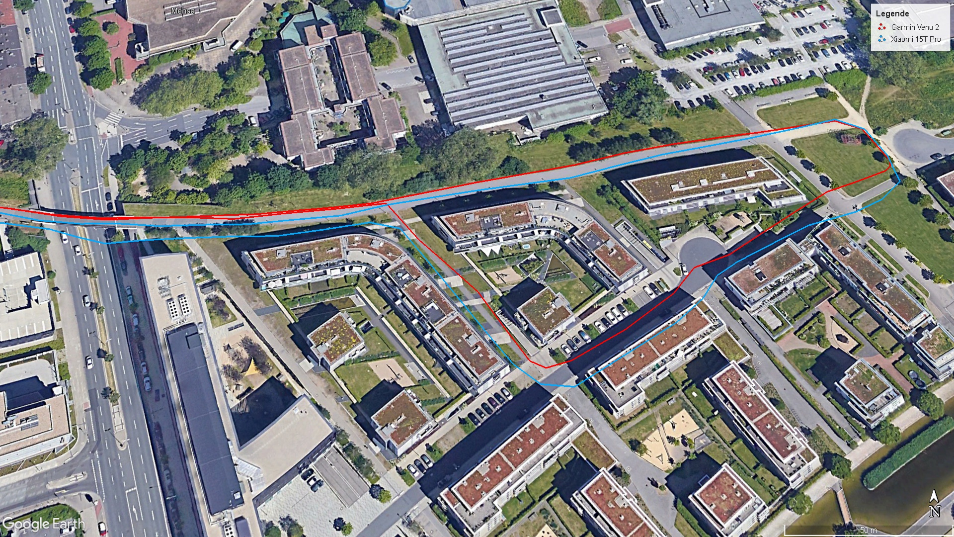 During a bike ride, we compared the Xiaomi 15T Pro with the Garmin Venu 2. At times, the smartphone's recorded track deviated slightly from the actual route, but there were no practical limitations for navigation tasks.