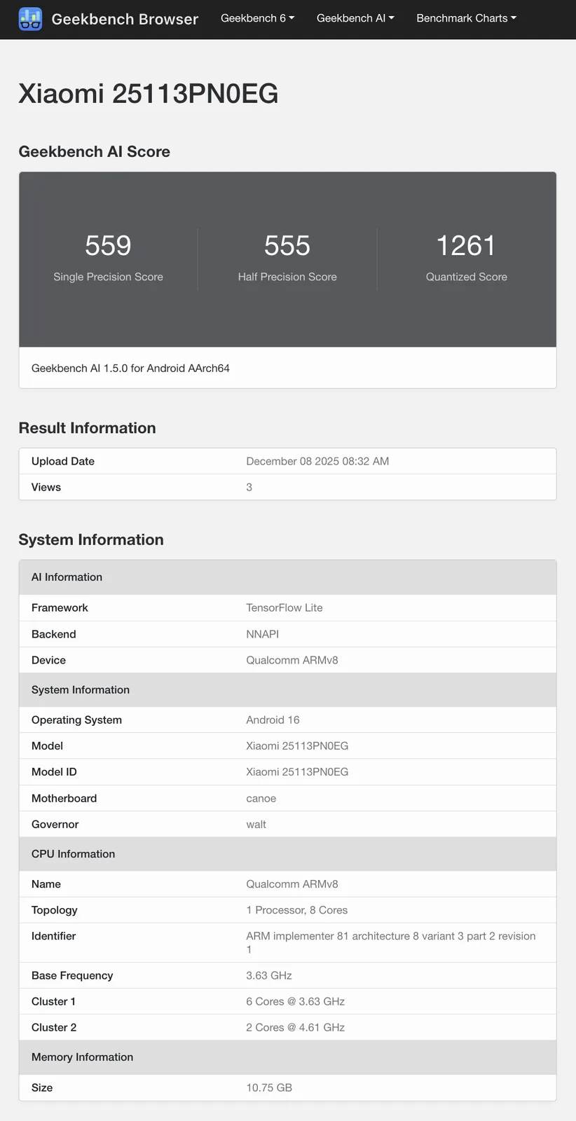 Specifically, Xiaomi has certified the Xiaomi 17 for sale with the National Broadcasting and Telecommunications Commission (NBTC) in Thailand. Ultimately, the NBTC only links 25113PN0EG to the Xiaomi 17. However, this global model number has appeared on Geekbench simultaneously. From this listing, we can glean that the global Xiaomi 17 will feature the regular Snapdragon 8 Elite Gen 5 chipset, just like its Chinese counterpart. Not only that, but the Xiaomi 17 will start with 12 GB of RAM internationally too.