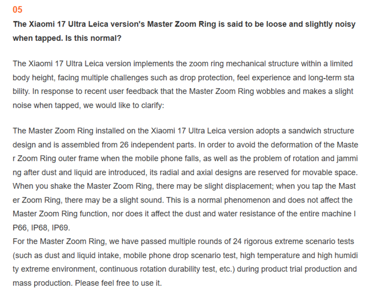 Xiaomi has addressed the criticism, as well as some other community concerns and questions, in a lengthy article on Weibo, denying production issues exist. According to the company, the rotating part is intentionally loose to ensure stable operation even after drops or contact with dirt or liquids. Xiaomi also states that noises when shaking the product are normal. We have embedded a machine-translated excerpt from the article below. What Xiaomi does not explain is why some of the rings, such as the one on a phone belonging to X user @Devinarde, do not wobble.