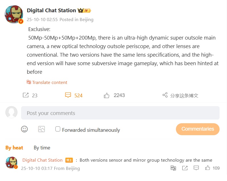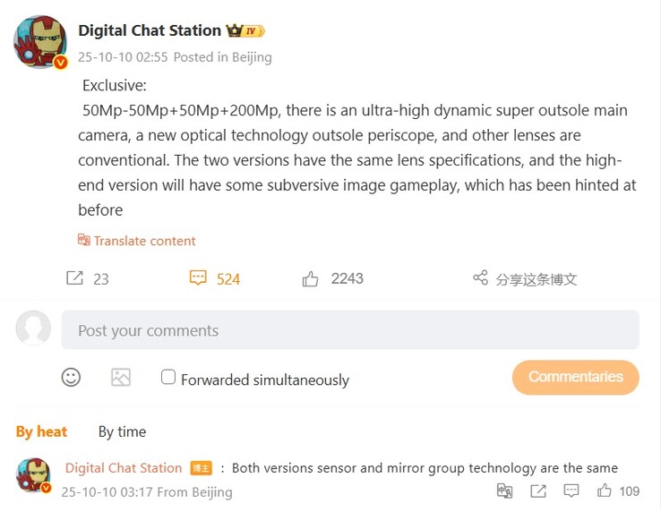 There is also other speculation on Weibo, which has been summarized by X-user @Devinarde (see below). In addition to an approximately 3-7x optical zoom, some Weibo users are also speculating about a sensor team consisting of the 1/1. 4-inch 200 MP ISOCELL HPE and the 1/1.276-inch ISOCELL JN5, which apparently form a kind of dual telephoto setup with optics that may work similarly to the Huawei Pura 80 Ultra with its movable slider, only in reverse.