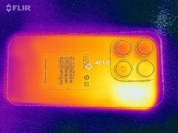 (-) The maximum temperature on the upper side is 48.7 °C / 120 F, compared to the average of 35.2 °C / 95 F, ranging from 21.9 to 247 °C for the class Smartphone.