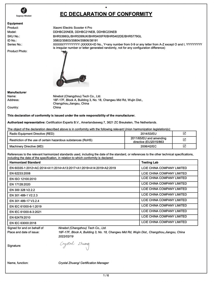 Xiaomi has published certification documents for the Electric Scooter 4 Pro, despite having not officially unveiled the device. As the screenshot below shows, Xiaomi has received an EC Declaration of Conformity (CE) for the electric scooter, reproduced in English, French, German, Italian, Polish and Spanish. It is unclear why Xiaomi has published the CE document itself, but all six language versions can be viewed via the link below.