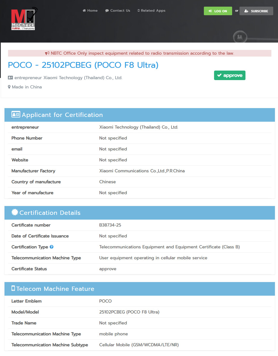 Now, that second model number has emerged on the National Broadcasting and Telecommunications Commission (NBTC) in Thailand. Shown below, the NBTC listing essentially confirms that Xiaomi is working towards offering the 25102PCBEG globally. Not only that, but it is the first time that 25102PCBEG has been explicitly linked to the real name ‘Poco F8 Ultra’.