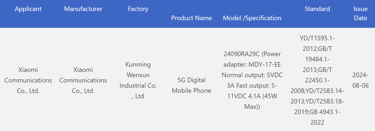 Previously, it was unclear with what retail names these model numbers were associated. However, a recent 3C listing has shed some light on 24090RA29C and where it sits in Xiaomi's Redmi Note 14 product stack. As the image below shows, Xiaomi has certified 24090RA29C with MDY-17-EE, an unreleased charger that received approval from the 3C a few months ago.