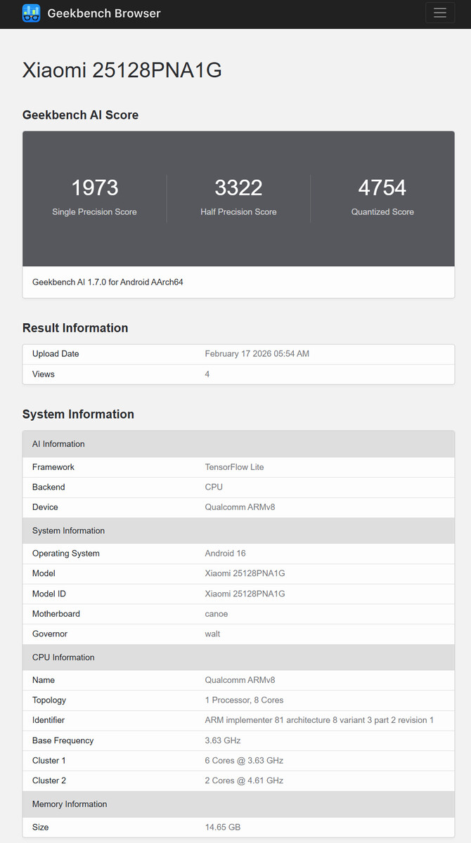 Recently, leaks have focused on global availability of the Xiaomi 17 and Xiaomi 17 Ultra. In short, various sources expect the pair to match the prices of the Xiaomi 15 Ultra and its smaller sibling (curr. $809 on Amazon). While equivalent details about the Leica Edition remain unknown for now, the global version has finally appeared on Geekbench under the model number 25128PNA1G.