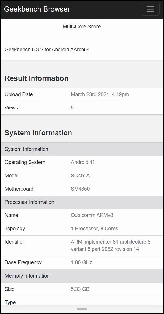 A screenshot allegedly taken from Geekbench 5 has offered up some potential details about an upcoming Sony smartphone. Records from this benchmark can be easily doctored and there is a distinct lack of details with this screenshot, so salt-pinching time for Xperia Compact fans here. The image, shared by a Reddit user called u/McKeeth0ON, describes a model “Sony A” that is powered by an SM4350 chipset from Qualcomm. This points to the new Snapdragon 480 that aims to bring 5G connectivity to the mid-range masses.