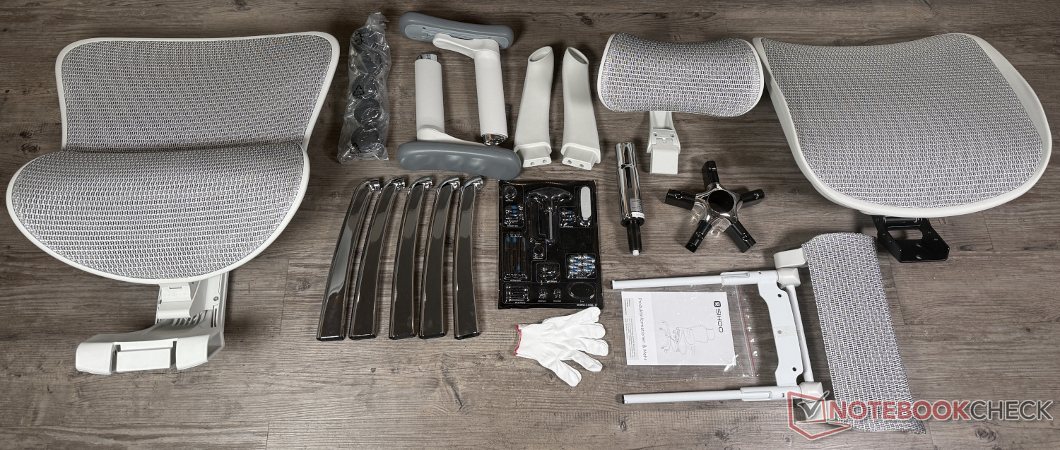 The ergonomic office chair was delivered in two rather large and heavy boxes. Unpacked, they contain around 20 parts as well as a whole range of screws and other small parts. The advantage is that all the tools are included in the scope of delivery, so there is no need to dig in the toolbox. Another positive aspect is that the manufacturer does not use large polystyrene blocks as packaging material and instead uses cardboard. In the end, a 25-liter bin bag was still full of bags and other plastic waste.