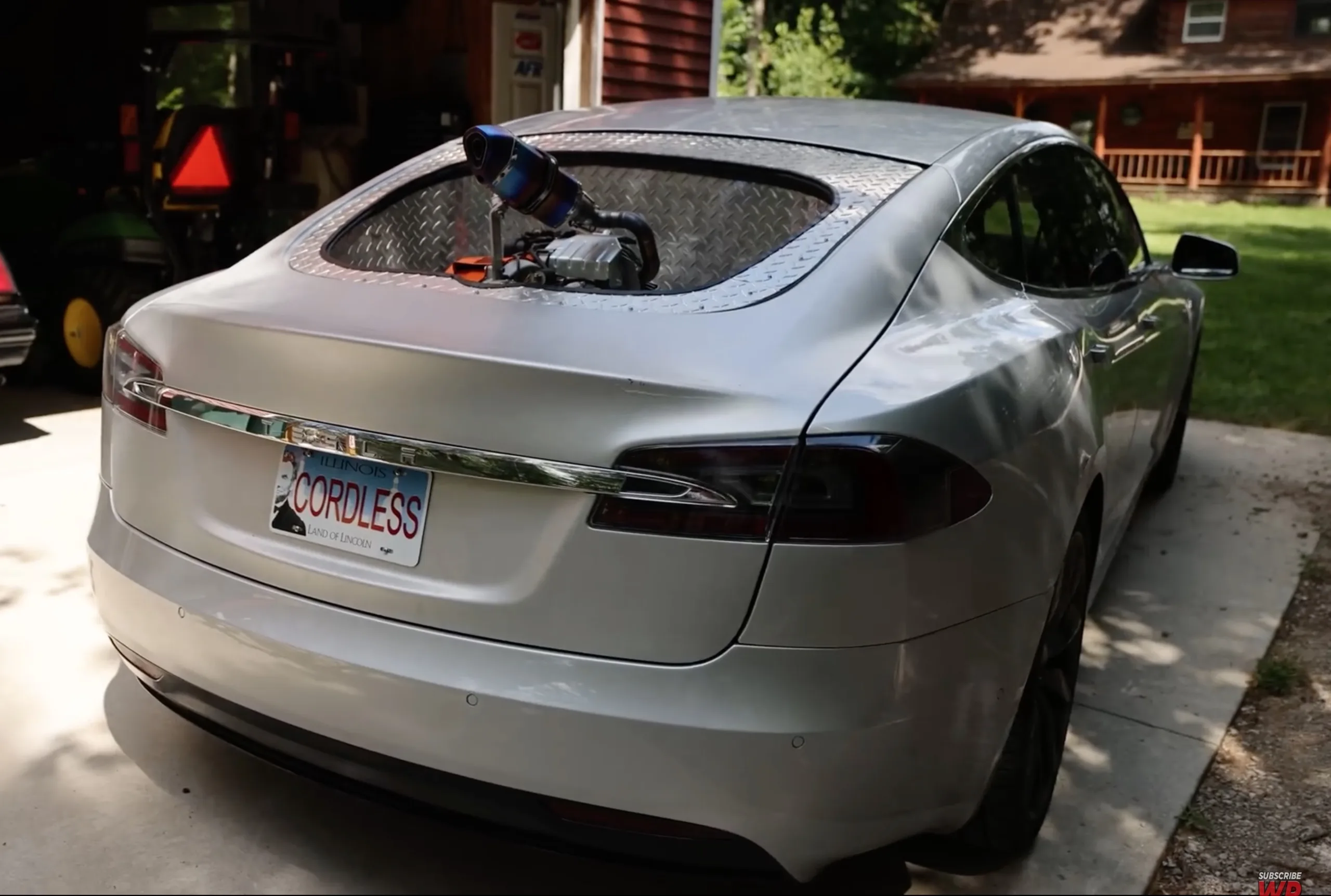 For this purpose, the ingenious tinkerer and host of the successful YouTube channel "Warped Perceptions" placed a small one-cylinder gas generator with 400cc and about 13 hp in the back of his Tesla Model S, which apparently allowed him to continuously charge the battery of the electric car while driving. As a result, he claims that he didn’t need to stop at a single charging station over the course of his long road trip in the American Midwest, but unfortunately, his Tesla Model S was limited to rather slow speeds since the small generator could not provide enough energy to keep the EV’s battery charged when traveling at regular highway speeds.