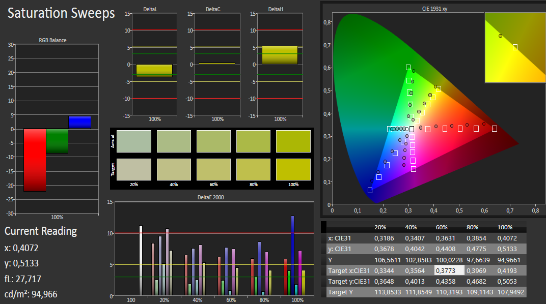 | Color Space (Percent of AdobeRGB 1998) (%) | 47 | 50.6 8% | 53.88 15% | 46.5 -1% | 44 -6% | 46.68 -1% | 57.17 22% | |||