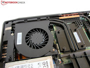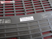RAM is supplied by 2x SODIMM G.Skill modules for a total of 16 GB and with 2x more SODIMM slots to spare on the bottom of the notebook. Opening up the panel will also reveal the two system fans, subwoofer, M.2 SSDs, 2.5-inch HDD and both the CPU and GPU.