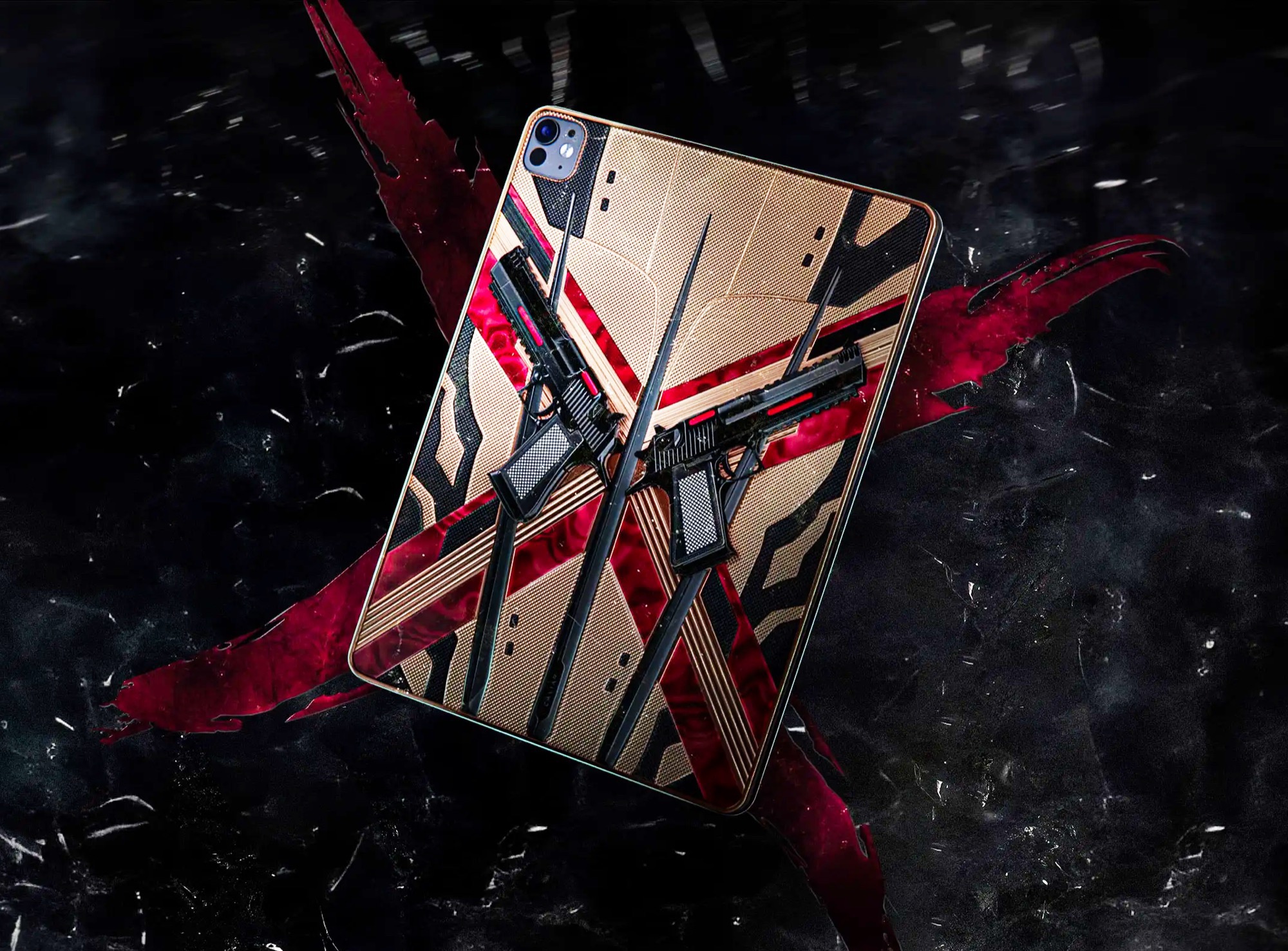 Specifically, there are two Desert Eagle Mark XIX, which are implemented as a relief. The back features an eye-catching combination of gold and red, with the golden "X" behind the pistols being coated with 24-carat gold. The casing will be made of titanium instead of aluminum like the regular iPad Pro, making the tablet much harder to bend. The PVD coating should make the casing extremely scratch-resistant.