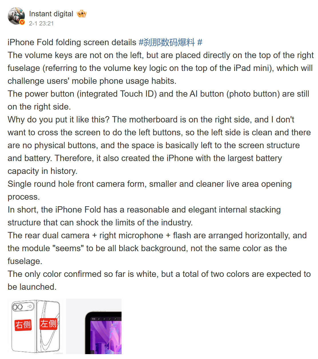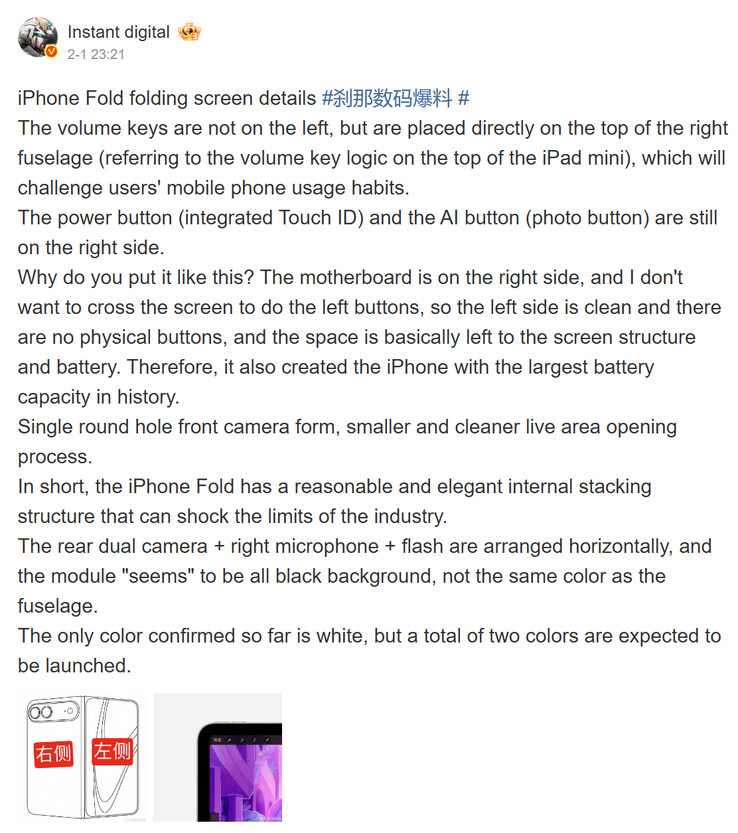 In other words, Fixed Focus Digital suggests that Apple's foldable will launch with 25% and 10% battery advantages over the Galaxy Z Fold7 and Pixel 10 Pro Fold, respectively (curr. $1,499 on Amazon). In a more recent post, Instant Digital reiterates Fixed Focus Digital's claim, adding that an absence of physical buttons on the foldable's left-hand side has allowed Apple to maximise battery capacity.