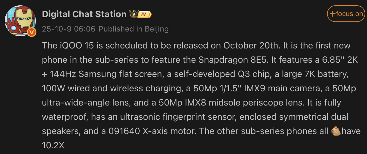 Posting on its official Weibo account, the company has stated that the iQoo 15 will be unveiled on October 20 at 7:00 PM local time in Shenzhen. Additionally, the company revealed that the device will go on sale immediately following the event. Note that this launch is specific to the Chinese market; the global release date was not revealed at the time of writing.